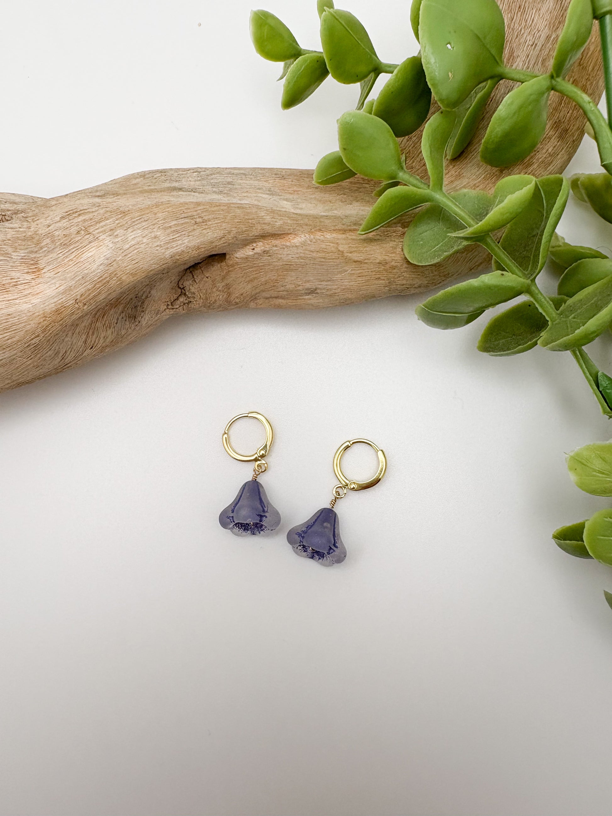 A ceramic blue bell flower bead on a 16k gold filled huggie.