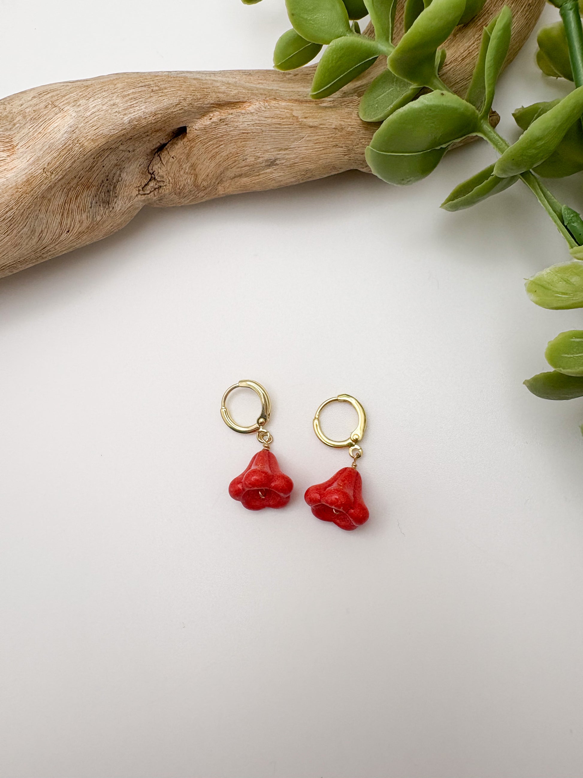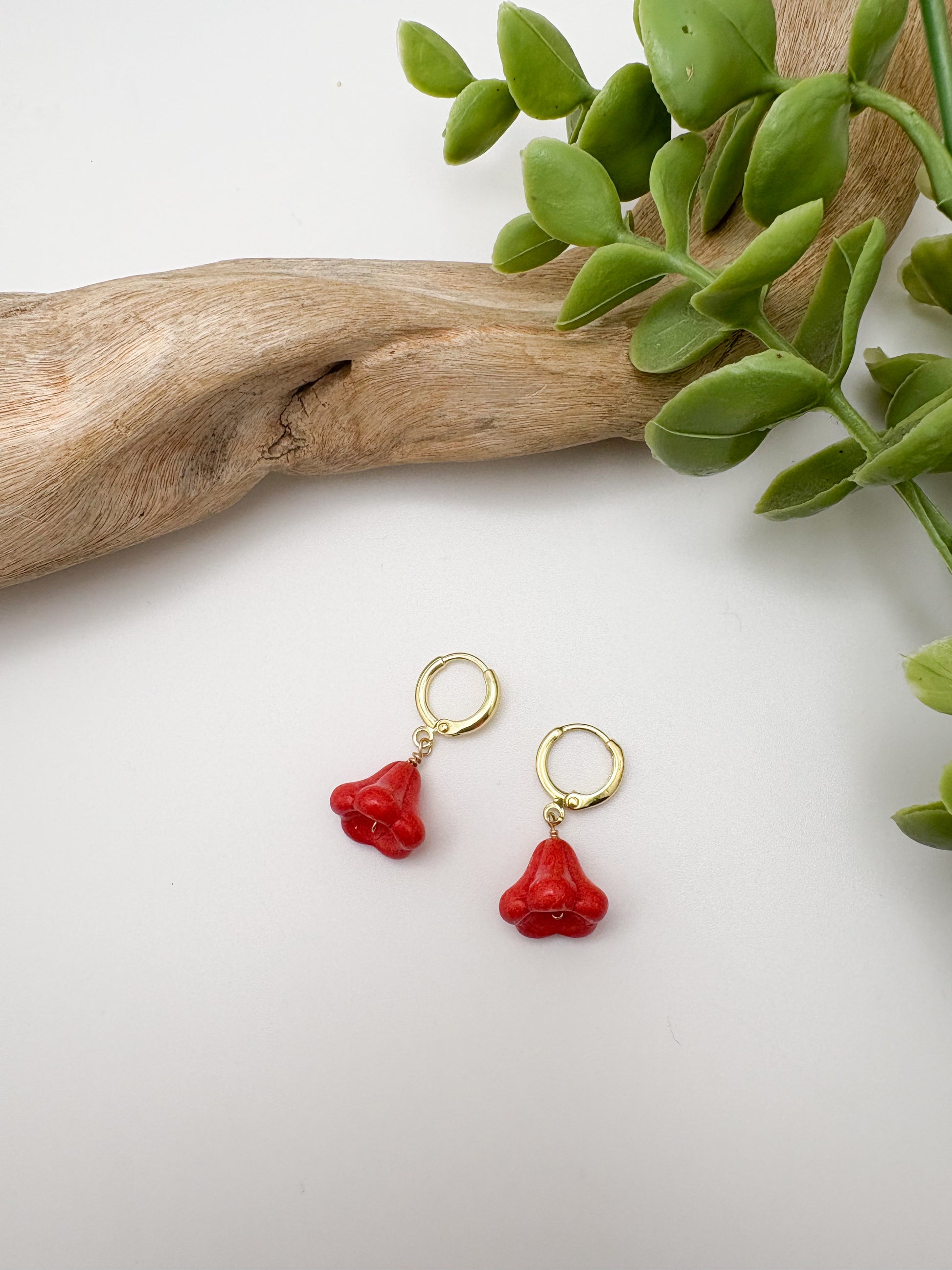 A ceramic bell flower bead on a 16k gold filled huggie earring.